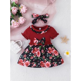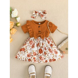 Baby Girl's Adorable Ruffle Trim Plaid Stitching Long Sleeve Dress + Headband Set